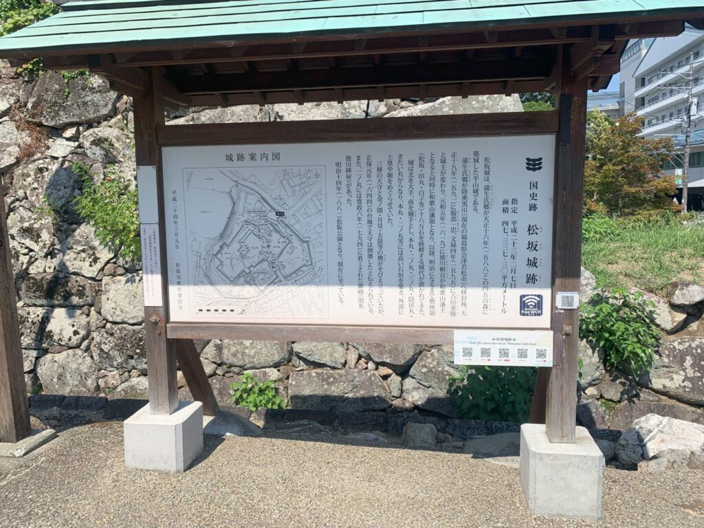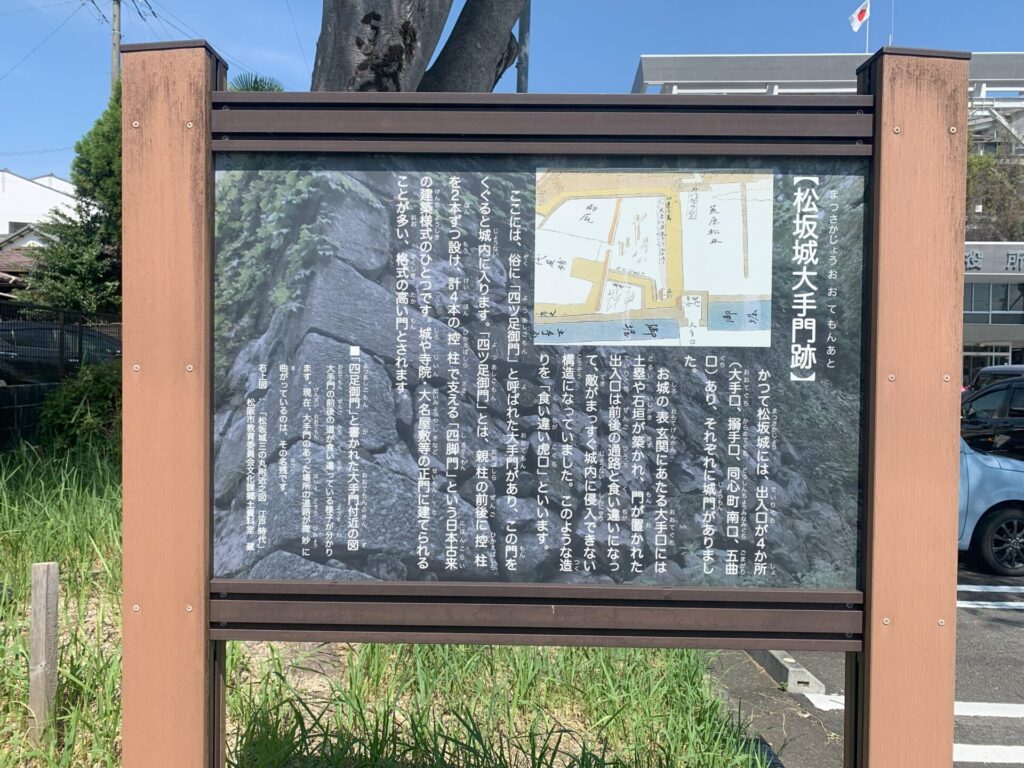 城跡に向かって歩いていると市役所の前に大手門跡の説明書きがありさらに進むと表門跡があり「国史跡 松坂城跡」の説明書きがあります。