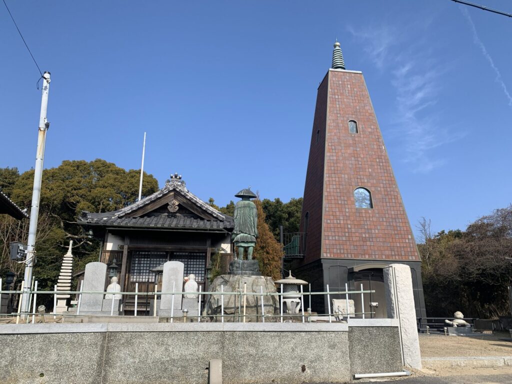 近代的な塔、弘法大師像と並んで海や魚に関係の深い魚藍観音像があります。