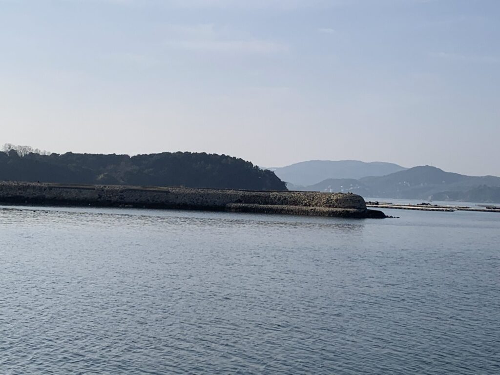 神社の横の海岸から入江越しに元禄防波堤が見えます。