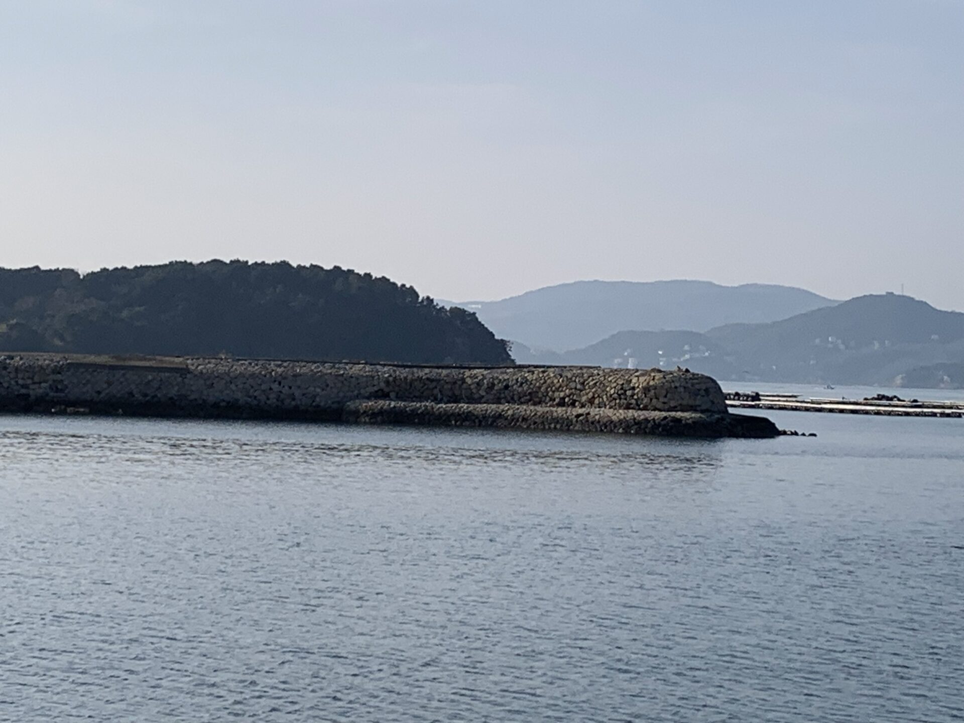 神社の横の海岸から入江越しに元禄防波堤が見えます。