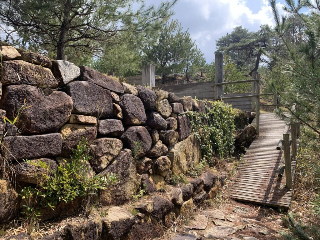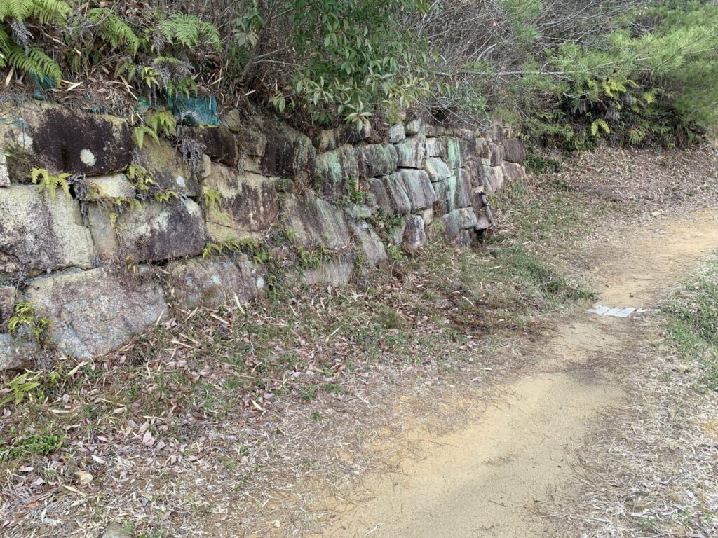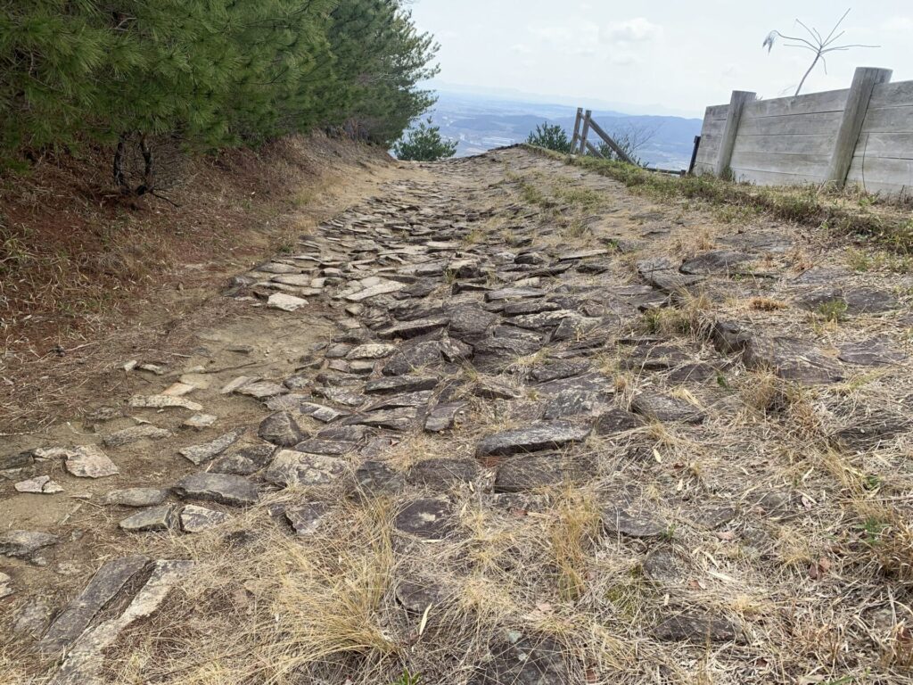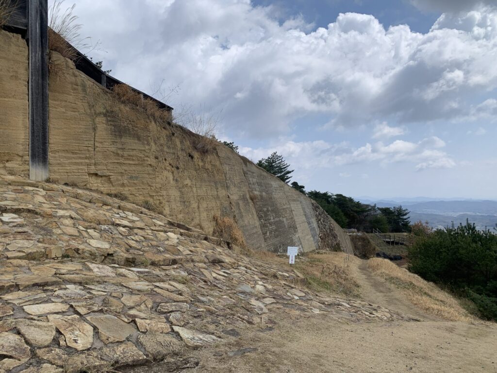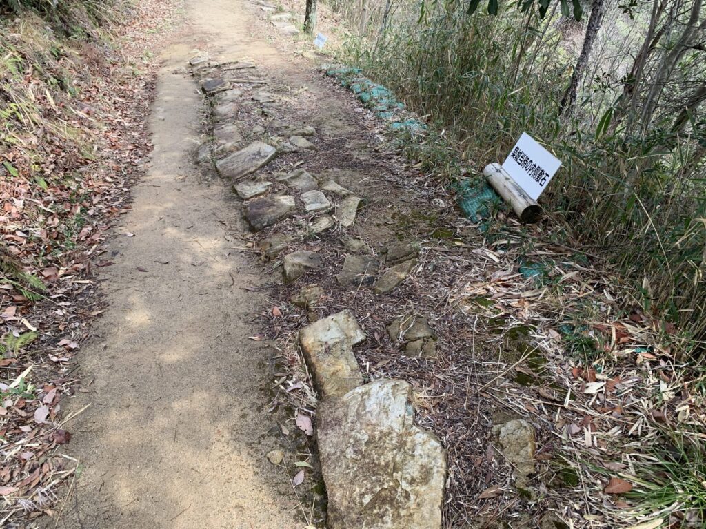 敷石は通路としての役割もあるようですが傾斜がつけられていることから雨水等が城壁を壊すのを防ぐ目的で敷かれたのではないかと考えられているようです。またこのような敷石は日本の古代山城ではここだけにしか見られないようです。