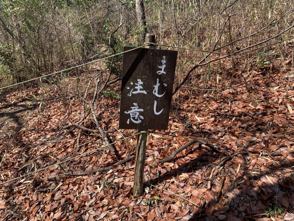 途中「まむし注意」の看板があります。何ヶ所かありますが遊歩道から外れて茂みの中には入らないようにしましょう。