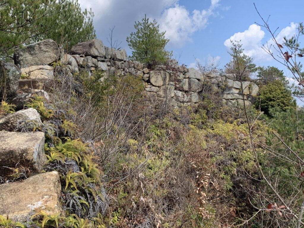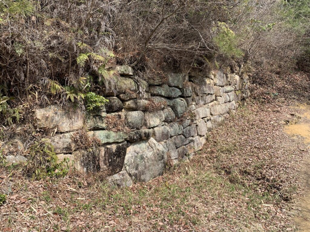 東門跡から歩き始めると屏風折れの石垣が望めます。石垣目指して歩いて行きます。