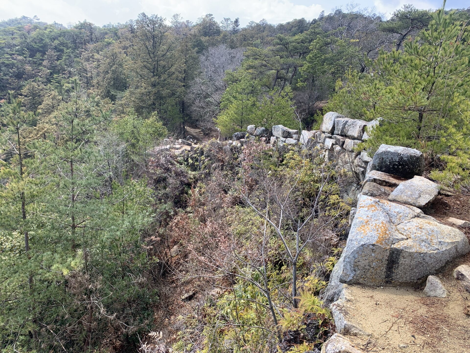 東門跡から歩き始めると屏風折れの石垣が望めます。石垣目指して歩いて行きます。