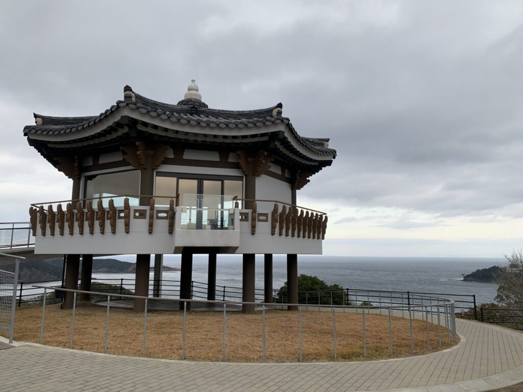 韓国風の建物が印象的です。スッキリとしない天気で写真では判りにくいと思いますがぼんやりと釜山の町が見えます。天気予報もよくないので難しいかなと思いましたが見えました。それだけ近いということなのでしょうか。
