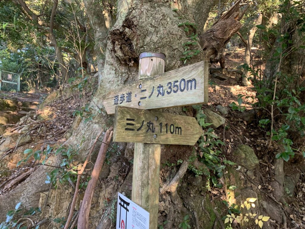 二ノ丸から一ノ丸を目指して上ります。110mの表示ですが相変わらず石が多くまた上りがきつくなります。足元に気を取られながら7~8分上っていくと石垣が見えてきます。