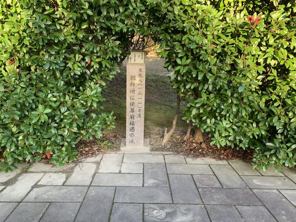 櫓門を通り抜けると広場があり、主に家臣が利用するためだったとされる御台所門跡があります。さらに進んでいくと朝鮮通信使幕府接遇の地の碑があります。