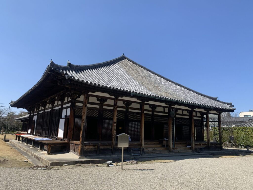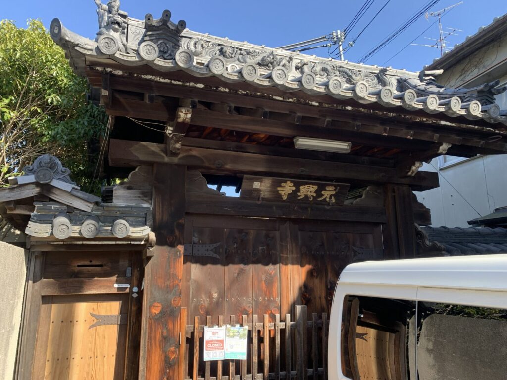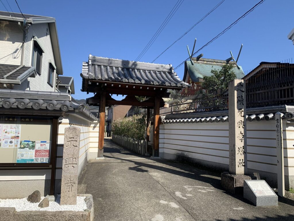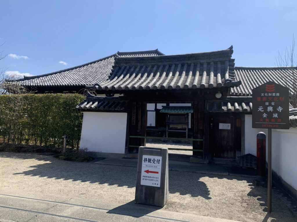 残念ながら門が閉まっていて中に何があるのか分かりませんが、「元興寺」の文字はあります。