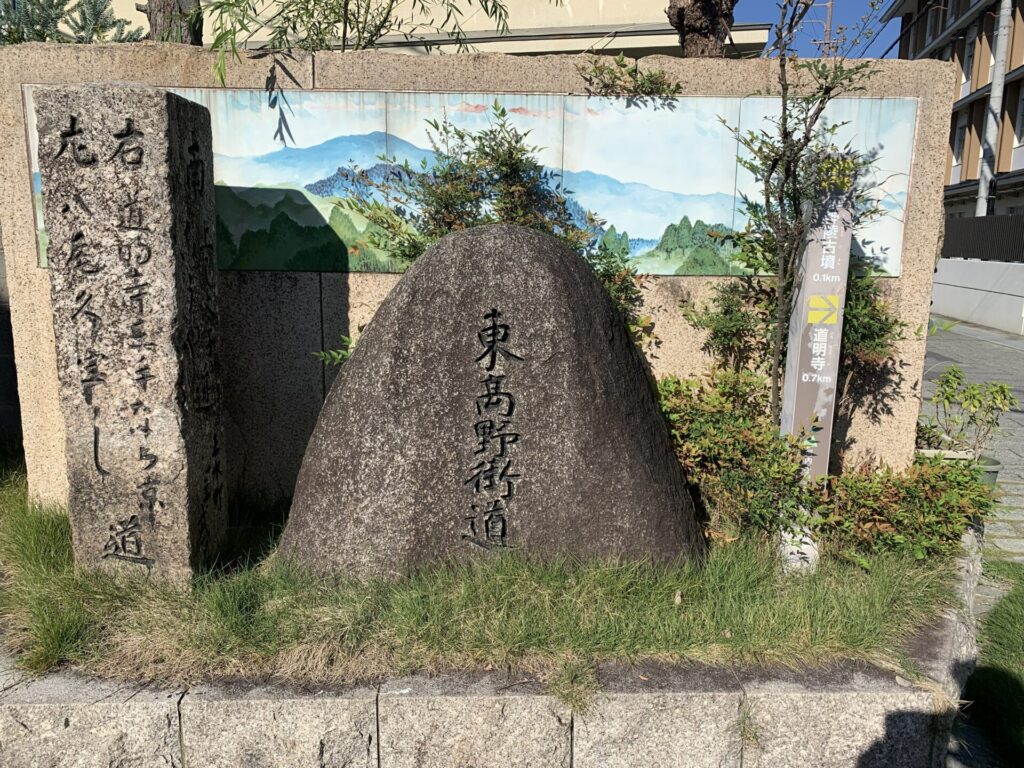 東高野街道は京都から高野山への参詣道として用いられた道。弘法大師空海が何度も往復し、休んだと伝わる石が残っています。道明寺が京都の東寺と高野山の中間地点になるようです。