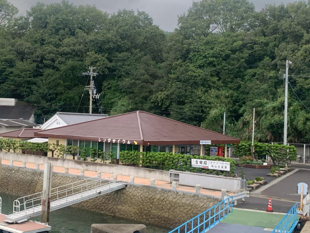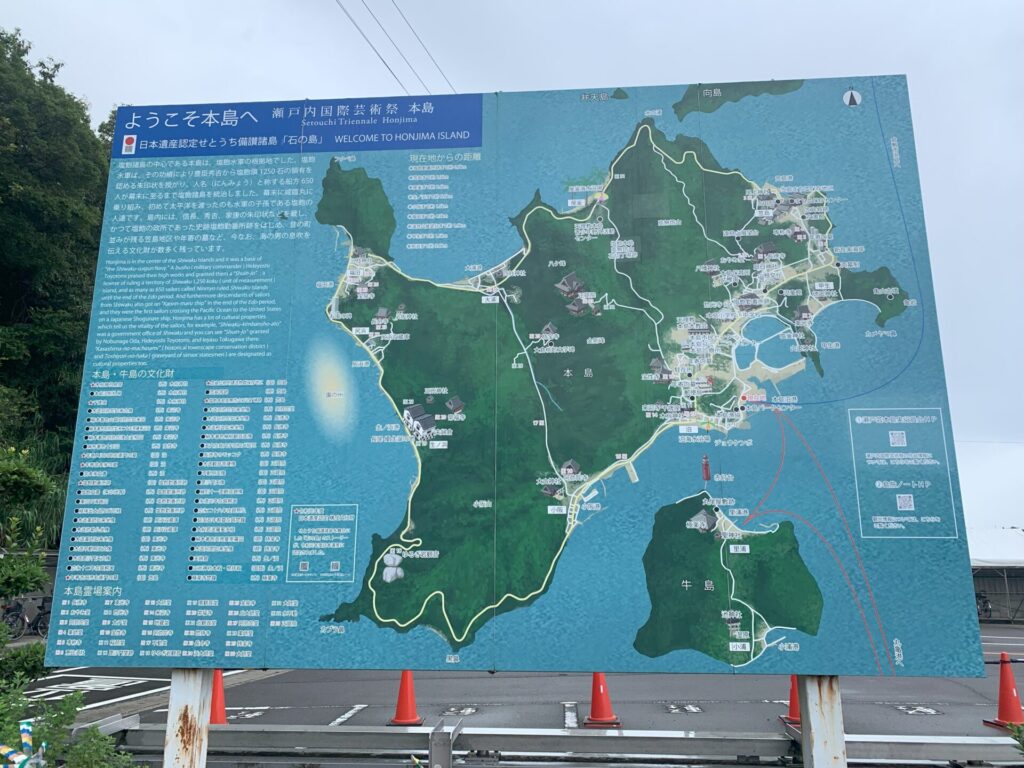 船は岡山県の児島港と香川県の丸亀港から出ていますが丸亀港からの船を利用します。フェリー(車搭載可)と旅客船で合計8便程度あり、フェリーで35分程度、旅客船だと20分程度で到着します。島内移動はレンタサイクルを利用、船の待合所に併設されています。