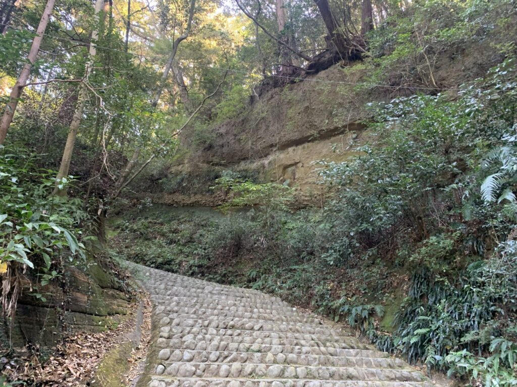 上りはじめてすぐに急な崖の横を通ります。道は整備されていますが結構急な上りです、難攻不落の片りんというところでしょうか。