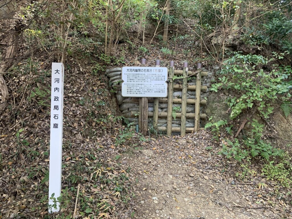 説明書きにもありますが1574年、徳川方に属していた高天神城は武田勝頼の大軍に攻められます。城主の小笠原長忠は已む無く城兵の助命を条件に開城しますが、軍目付(いくさめつけ)を務めていた大河内政局は徳川家康への忠義を貫き勝頼に従わなかったためこの石窟に幽閉されてしまいました。家康が奪還できたのは約7年後、その間幽閉された政局は視力を失い歩行も困難になっていたようですが、家康は過分の恩賞を与えねぎらったとのこと。忠義の深さに驚きです。