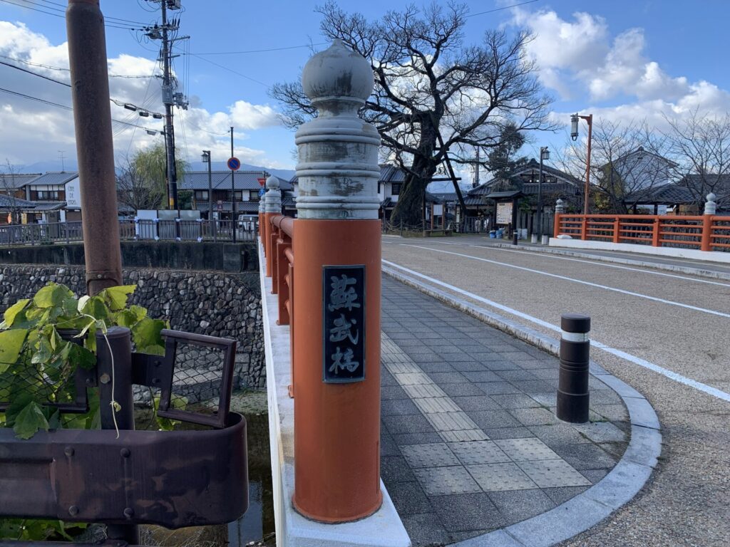 案内に沿って歩いていくとすぐに説明書きがあり、目印となる赤い橋、蘇武橋があります。