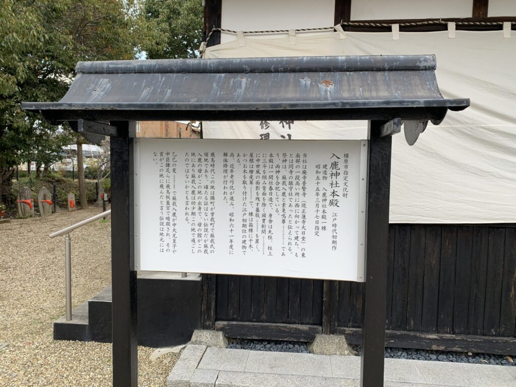 入鹿神社は全国で唯一蘇我入鹿を祀った神社。蘇我入鹿については歴史の授業で習ったと思いますが乙巳の変で中大兄皇子(後の天智天皇)と藤原鎌足に討たれた人物。